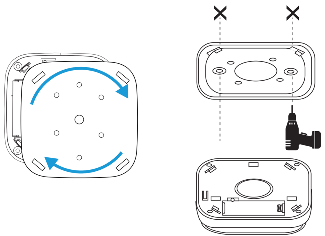 | (2) Retira la tapa trasera del detector girándola en el sentido contrario a las agujas del reloj. Marca los agujeros de instalación de la tapa en el techo y taládralos. Atornilla la tapa trasera al techo ayudándote de los tacos y tornillos incluidos. | (3) Retira el material de aislamiento de la pila e insértala en su compartimento, alineando sus polaridades correctamente. |