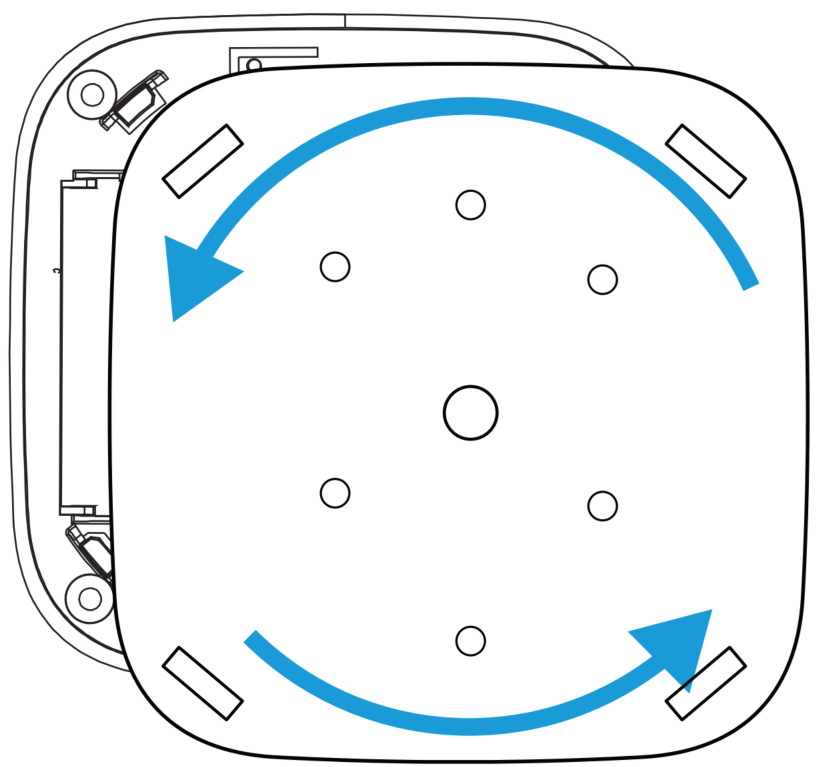| (4) Gira el detector de humo en el sentido de las agujas del reloj para ajustarlo firmemente a la tapa posterior ya instalada. | (5) Pulsa el botón central del dispositivo. El detector emitirá 2 ciclos de 3 pitidos de alarma y el LED parpadeará en la misma secuencia en rojo, confirmando el correcto funcionamiento del dispositivo. Se recomienda llevar a cabo el test de al menos una vez en semana para comprobar que el dispositivo emite las alarmas sonoras y visuales correctamente. |