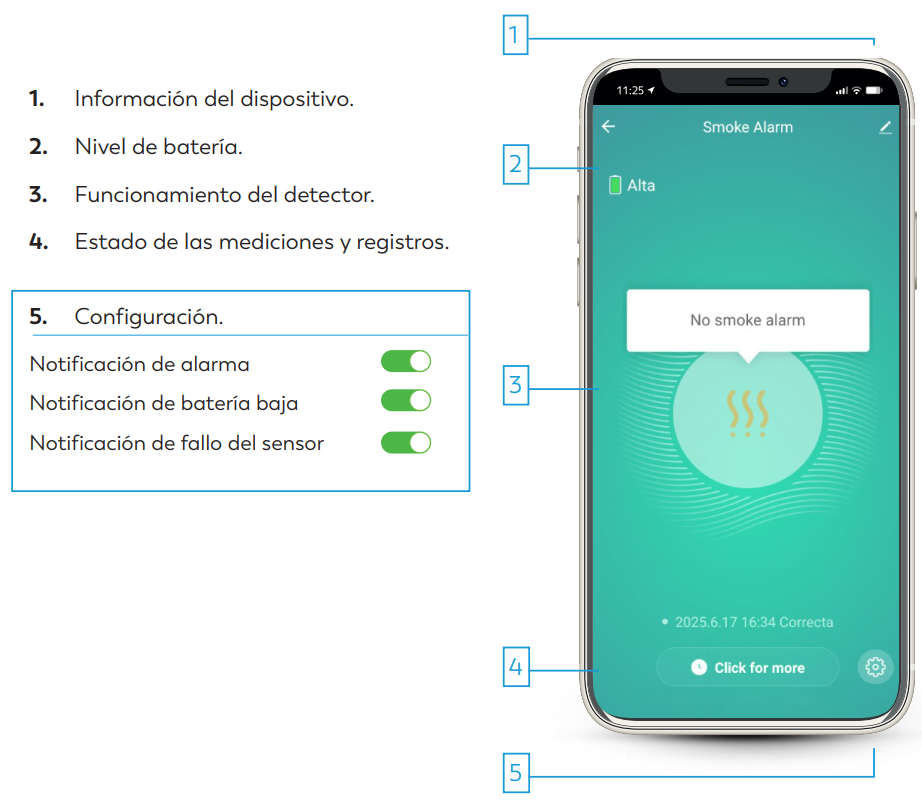 - Evita caídas o golpes, y no manipules ni abras el detector, ya que esto puede comprometer su rendimiento. El uso inadecuado, cubrir el dispositivo, pintar, superar los rangos de temperatura o humedad recomendados, o el mal mantenimiento puede reducir o anular su capacidad de detección.
