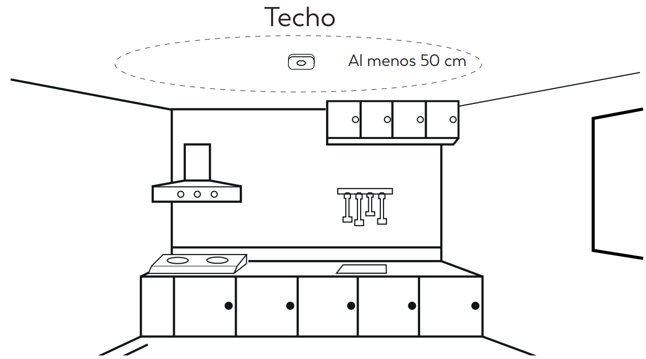 - Debe instalarse, al menos, a 150cm de distancia de luces, extractores, aires acondicionados y entradas y salidas de aire.