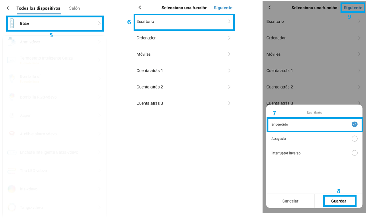 | Elije tu dispositivo. | Elije el enchufe previamente nombrado que quieras encender / apagar mediante tu asistente de voz. | Elije la función encendido (o apagado, en el caso de que estés creando una escena para apagar el enchufe) y pulsa "Guardar". |