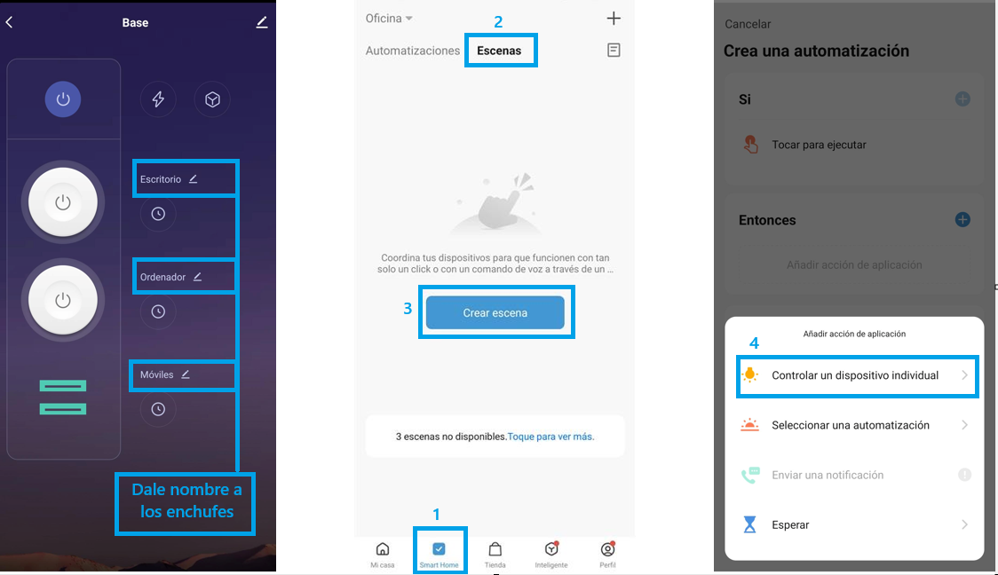 | Edita el nombre de tus enchufes. | Accede al espacio Smart Home y selecciona "Escenas" - "Crear escena". | Selecciona "Controlar un dispositivo individual". |