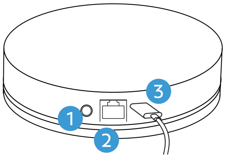 (1) Botón de reinicio | ![]() | (2)Cable de Ethernet (3) Alimentación |
