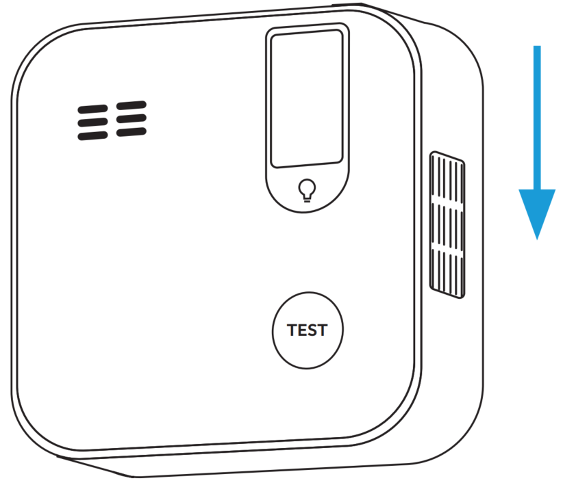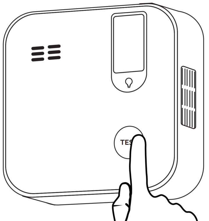 (6) Fija el detector a la tapa previamente instalada. | (7) Pulsa el botón “Test”. El detector emitirá 4 pitidos de alarma y el LED del dispositivo parpadeará en la misma secuencia en rojo, verde, amarillo y rojo nuevamente. Se recomienda llevar a cabo el test de funcionamiento al menos una vez en semana para comprobar que el dispositivo emite las alarmas sonoras y visuales correctamente. |