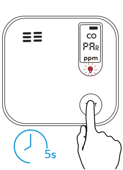 ![]() | Elimina el dispositivo de tu app Garza Smart si había sido vinculado previamente. Mantén pulsado el botón “Test” durante más de 5 segundos. El LED comenzará a parpadear en rojo rápidamente (una vez por segundo) y en la pantalla se mostrará “Par”, indicando que el dispositivo está listo para ser vinculado. Si no parpadea, o parpadea lentamente, mantén pulsado el botón “Test” de nuevo durante 5 segundos para que entre en modo vinculación rápida. |