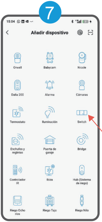 (7) Selecciona "Switch". | (8) Elige tu red wifi de 2,4 GHz e introduce su contraseña. La contraseña de tu red wifi puede estar en la parte trasera del router. Asegúrate de que tu móvil también está conectado a la red wifi 2,4GHz a través de los ajustes de wifi de tu smartphone. | (9) Pulsa "Terminar" para finalizar el proceso de vinculación. El indicador luminoso de tu switch permanecerá encendido en azul. |