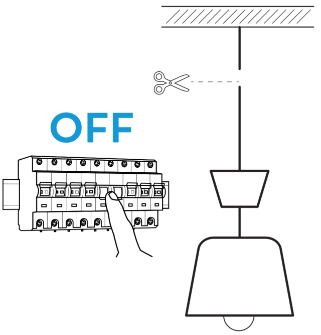 (1) Retira los tornillos de las tapas protectoras de las clemas del switch. | (2) Retira de la corriente o desenchufa el aparato que quieras domotizar. Corta el cable de alimentación. |